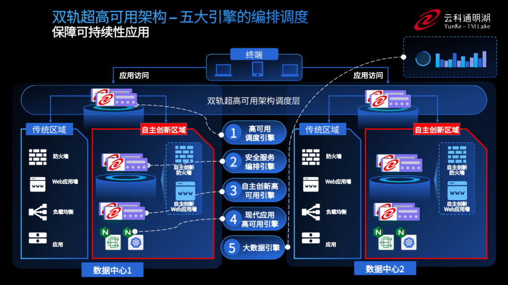 为实现双轨超高可用架构信创区和非信创区的跨域协同,实现信创区域和非信创区域的平滑过渡,东升国际通过五大引擎实现多层次的应用可持续性。